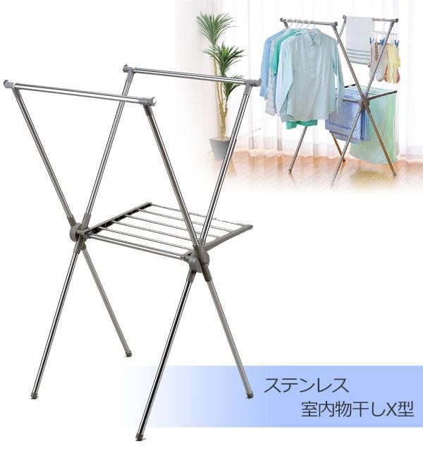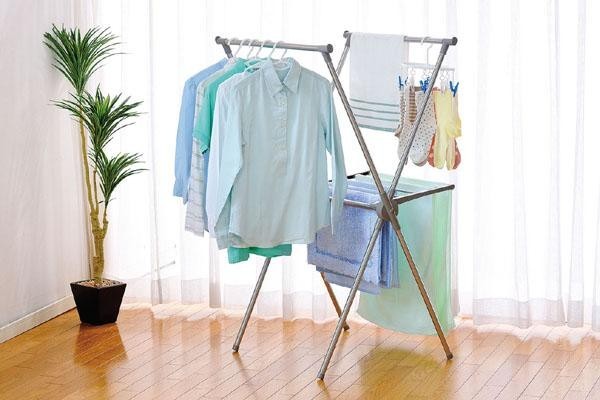 | シャツなどの衣類も並べて干せるX型室内物干し。 |