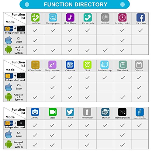 - More functions: Bluetooth Dialer, Pedometer, Sleep monitor, Sedentary Reminder, Music Player, Alarm Clock, Watch, Camera, Remote camera, Bluetooth SMS/IM Message Notifier, Message Reminder, Call Reminder, Answer Call, Dial Call.