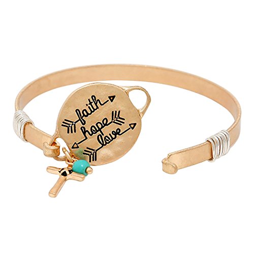 -. Binding : Jewelry -. Brand : Rosemarie Collections -. Color : Gold Tone -. Department : womens -. Feature : Metal bangle bracelet with wire wrap details and an easy hook closure / Featuring a hammered metal disc engraved with "faith hope lovet", and a cross charm with a turquoise bead / 8 inch circumference, comfortably fits small to medium wrists / Burnished metal bangle bracelet with a matte finish for a vintage look / Packaged in a lovely gift box -. Label : Rosemarie Collections -. Manufacturer : Rosemarie Collections -. Model : MU-SB00-99WG -. MPN : MU-SB00-99WG -. PartNumber : MU-SB00-99WG -. ProductGroup : Jewelry -. ProductTypeName : FASHIONNECKLACEBRACELETANKLET -. Publisher : Rosemarie Collections -. Studio : Rosemarie Collections -. Title : Rosemarie Collections Women's Religious Jewelry "Faith Hope Love" Charm Hook Bracelet