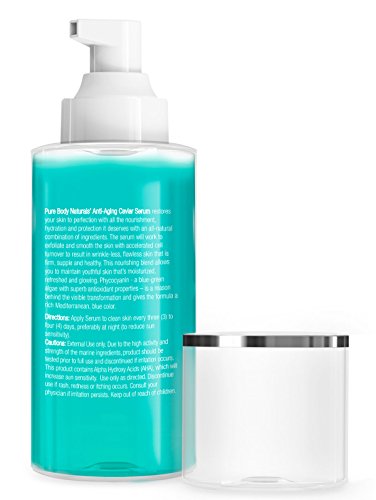 Pure Body Naturals Blue Marine Algae Caviar Anti Aging Serum is natural with powerful ingredient such as lactic acid (L), glycolic acid, acipenseridae (caviar) extract, sodium hyaluronate (L), seanamin SU (sorbitol, algae extract, carrageenan, bladderwrack, algin), glucosamine HCI (D), fructooligosaccharides (D-beta), and spirulina platensis (phycocyanin-C); no harmful chemicals