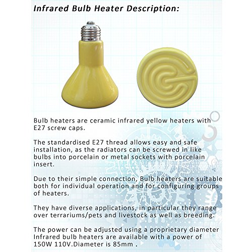 The power can be adjusted using a proprietary diameter Infrared bulb heaters are available with a power of 150W 110V. Diameter is 90mm.