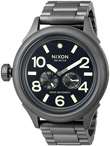 Inspired from the October, the October Tide features new wider lugs to give the ultimate robust feel makes it the perfect watch for deep sea exploration or withstand any off the map on the search for remote surf breaks. Movement: Nixon custom Swiss Made quartz 3 hand movement with analog tide, sub seconds function, and 9h crown and pusher placement. Dial: The dial features applied stainless steel hour and number indices and custom molded hands with the Tide subdial at 4 o'clock and a 60 second subdial with printed markers every 5 seconds at 8 o'clock. Case: 48.5mm, 300 meter / 30ATM custom sandwich construction solid stainless steel case, a solid stainless steel bezel, domed hardened mineral crystal with anti-glare treatment on the underside of the crystal, solid stainless steel triple gasket screw down crown with a custom molded rubber insert, stainless steel screw down caseback and spring pin lugs. Band: 23mm custom solid stainless steel free-swing 3 link bracelet and solid stainless steel double locking clasp with micro adjust.Feature