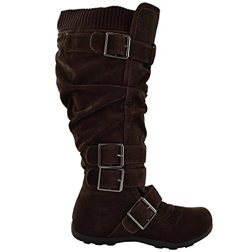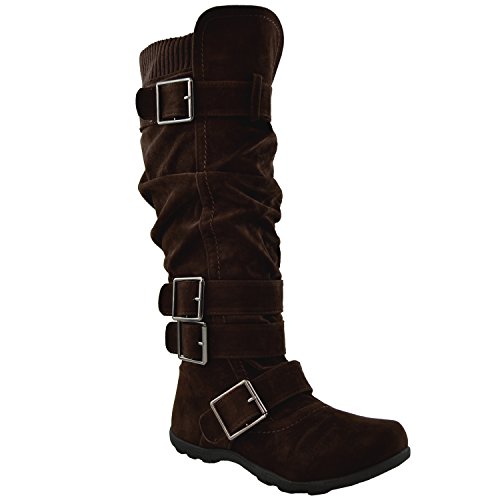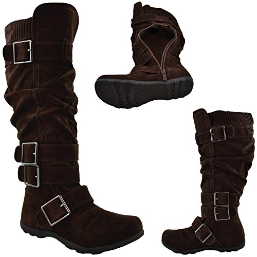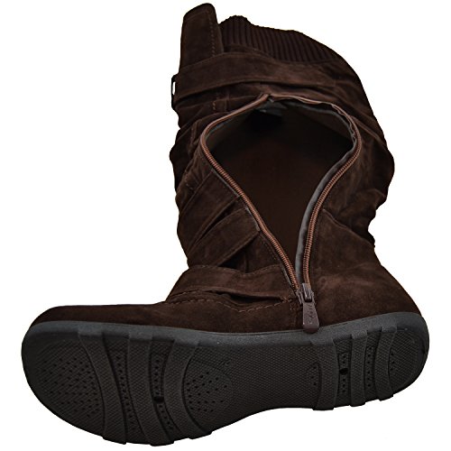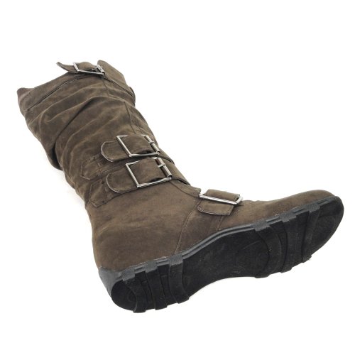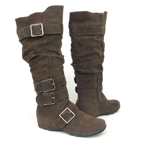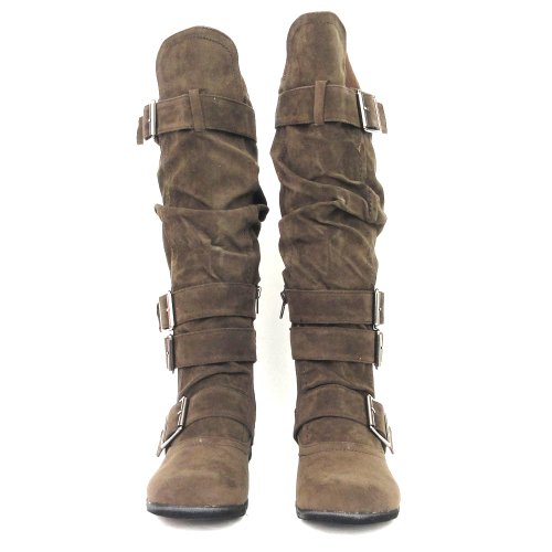 Binding : Apparel Product Description Be fashionable with these fabulour knee high suede boots that feature side zipper closure, multiple ankle straps, ruched detailing and adjustalble collar strap for a better fit. Length: 15a€? including heel approx. Opening Circumference: 16a€? approx. Material: Suede (man-made). Available in Dark Brown, Camel, Gray Black, size 5.5-10. Suggested Retail Price $59.99. 0