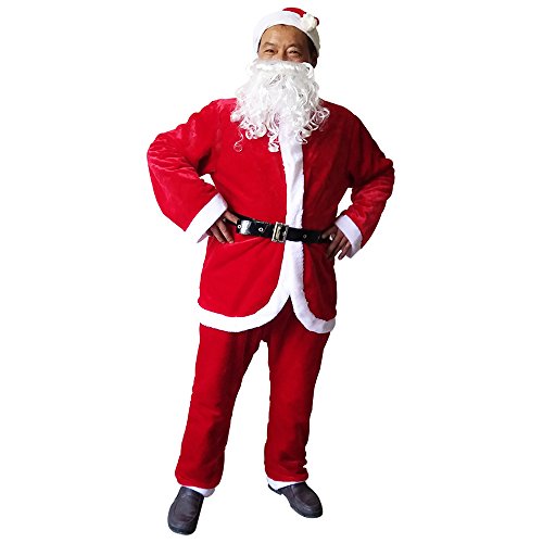 -. Feature : Important Costume Prop - Wear this Santa Suit you will be the perfect Jolly St. Nick, you will receive many smiles from kids&adult,and you will be the most popular people / 6 Pieces Santa Suit includes - Deep red plush Santa zipper coat,Pants,Santa Hat,Belt with Buckle,Boot Tops with matching White Plush Cuffs and Beard / Santa Suit Material - Be made of comfortable deep red velour trimmed with long plush faux fur.the Jacket of Christmas costume suit with Zipper Closure,Pants Adjustable With Elastic band / Good Quality - This Santa suit is Light weight but durable, which is easy to wear year after year / Size Information - This Christmas Santa Clause Suit Set is free size, it can fit many people. Coat breast: 43in-51in, Cloth Length 33in,waist: 25.6in-37.8in;Pants waist:25.6in-37.8in, pants length 37in;hat girth about 22.8in,so your head circumference below 58cm,then you can wear perfectly, and the height of hat is 17.5in