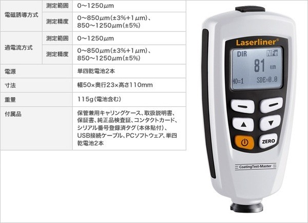 鉄(磁性金属)、非鉄(非磁性金属)、二つの素地を1台で測定できるハンディタイプの膜厚計、コーティングテストマスター。