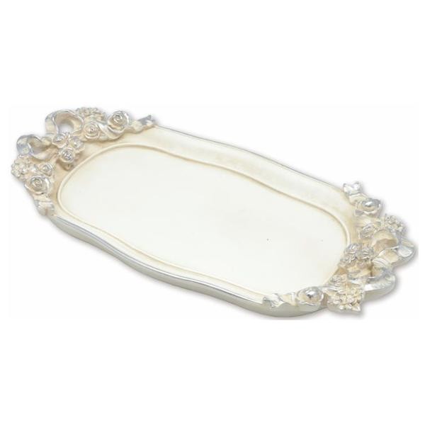 手作業でペイントされた味のあるアンティーク調のトレーです。エレガントな雰囲気で重厚感のあるお部屋にしてくれます。 生産国:中国 素材・材質:樹脂 商品サイズ:W28×D14×H3.5cm ※サプライヤー直送品 ご注文後3~4営業日後の出荷となります【商品名】ロイヤルアーデン トレー フレンチシルバー 25832