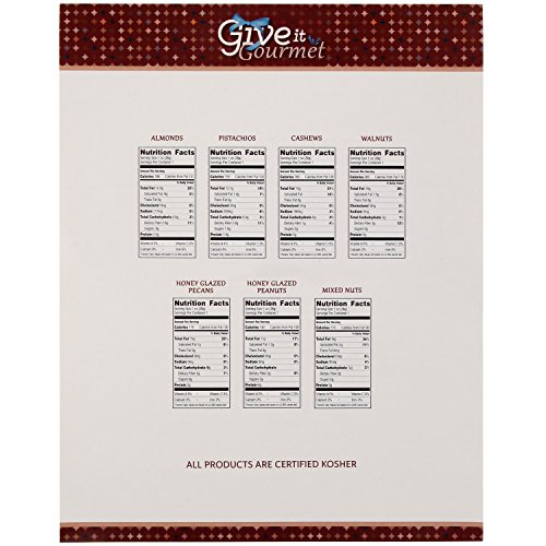 -. Feature : An Array of the Freshest Most delectable roasted Gourmet Nuts Packaged With a Shrink Wrap Seal For Utmost Satisfaction. / Displayed in an Artfully Designed Exquisite-Looking Box. Excellent Choice for All Gift Giving Occations / Luscious Roasted Salted, Cashews, Almonds, Pistachios, Mixed Nuts, Honey Glazed, Pecans and Peanuts, Raw Walnuts. / Risk Free, 100% Money Back Guarantee, No Questions Asked. All prodcut are certified Kosher / Even if not in need of a Gift, Just Treat yourself to this Delecable Healthy Snack.!!