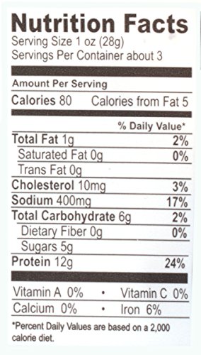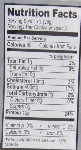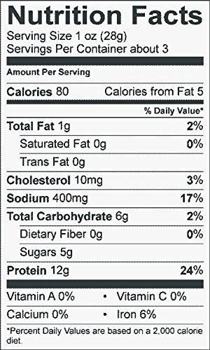 -. Feature : All natural, no artificial ingredients. / Low in carbohydrates, no MSG, gluten free, & 97% fat free. / 12 grams of protein per 1 ounce serving. / Still 3.25 ounce bag; 12%+ more than Jack Link's. / Proudly made in the USA.
