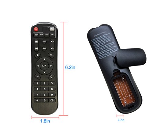 -. Feature : Compatible With Most TV Boxes: MXQ,MXQ PRO,M8, H96,H96 Pro Android tv box and so on / Mini Size: 6.2 * 1.8 * 0.7 inch. Mini design + Smooth tactility, It would be your good partner of the entertainment / Easy Use: No need to pair with anything ,Work directly after put in the battery, requires 2 AAA batteries (not inclued). Further details of key functions, as shown in figure 2 / Tips: The remote distance and Angle is not too big deviation, check whether the battery is installed is good. We have 12 months quality assurance of this remote control, please rest assured / If you are not sure whether it is fit for your box , you can feel freely contact with us