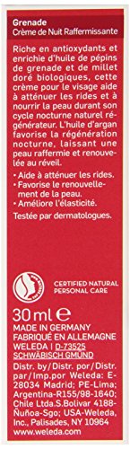 Weleda Pomegranate Firming Night Cream gives your skin an extra boost during the night when the skin’s repair processes are accelerated. Organic pomegranate seed oil and organic argan oil, both renowned for their skin-renewal properties, actively aid skin regeneration and leave it youthful and full of vitality. While you sleep, skin receives intensive hydration and nourishment thanks to organic borage seed oil, jojoba seed oil and macadamia nut oil, all rich in the nourishing essential fatty acids your skin needs to maintain its youthful firmness and vitality. You’ll wake up with skin that’s firm, resilient and ready to face the day. For best results, use with Weleda Pomegranate Firming Day Cream, Eye Cream and SerumFeature