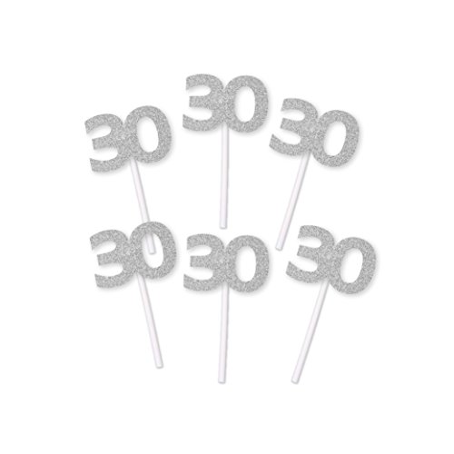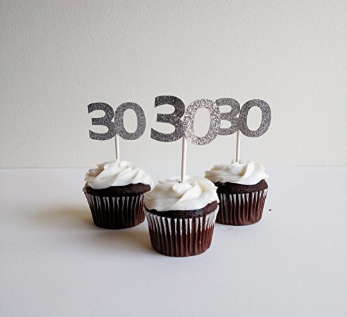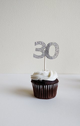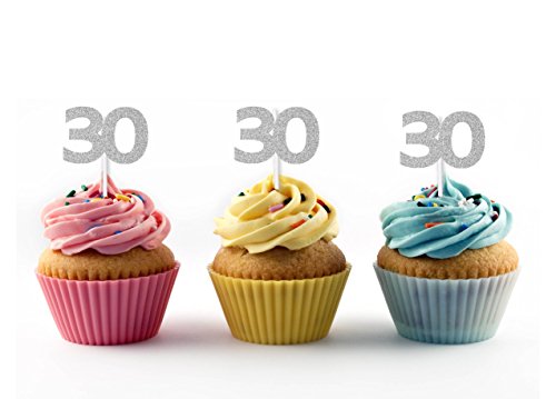 30th Birthday Cupcake toppers in Silver Glitter (20 count) - Anniversary, Retirement, Party Decorations