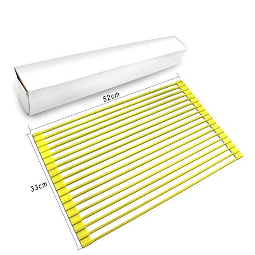 -. Feature : Heavy-duty space-saver multi-purpose over the sink dish drainer, not only can provide solutions to air-dry washed tableware, cookware, cutlery and kitchen utensil gadgets, but also can be used as vegetable colander and prep works platform over the sink. / High quality BPA Free silicone-coated steel, resistant to rust, non-slip and durable. / Heat resistant up to 400°F (204°C). Square bar design. Can be used as heat resistant trivet mat. / Size:52cm x 33 x 1cm. This size can perfectly fit general single draining sink and double sink. / Easy to clean and easy to storage.