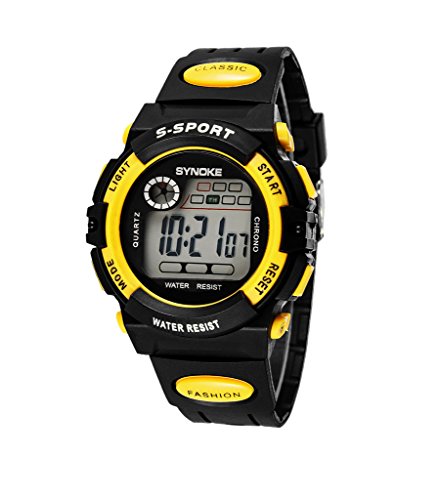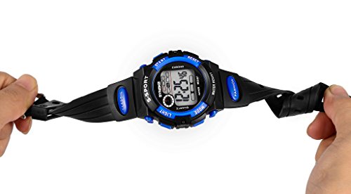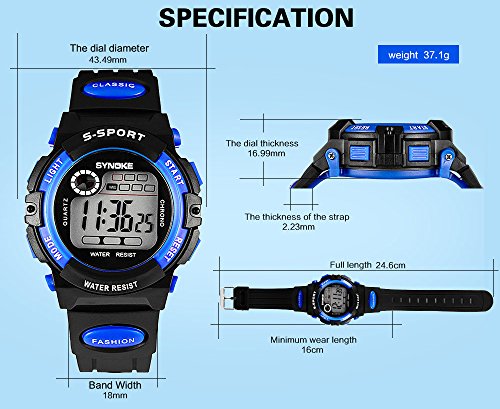 -. Feature : Kids watches designed for Boys and Girls, it is a good gift for children. / Electronic digital movement and plastic watchcase. / Multi-Functions: Luminous, alarm, life waterproof, the whole point, running seconds, week, date display, 12/24 hour system. / It is a water-resistant up to 30M, so it is safe to wear this watch while you are exercising, cleaning, swimming, at the beach or doing yard work. Note: Don't press any key under water. / Shock Resistant: The excellent ABS Plastic case and Stainless Steel case back which enable the watch to be tough and durable.