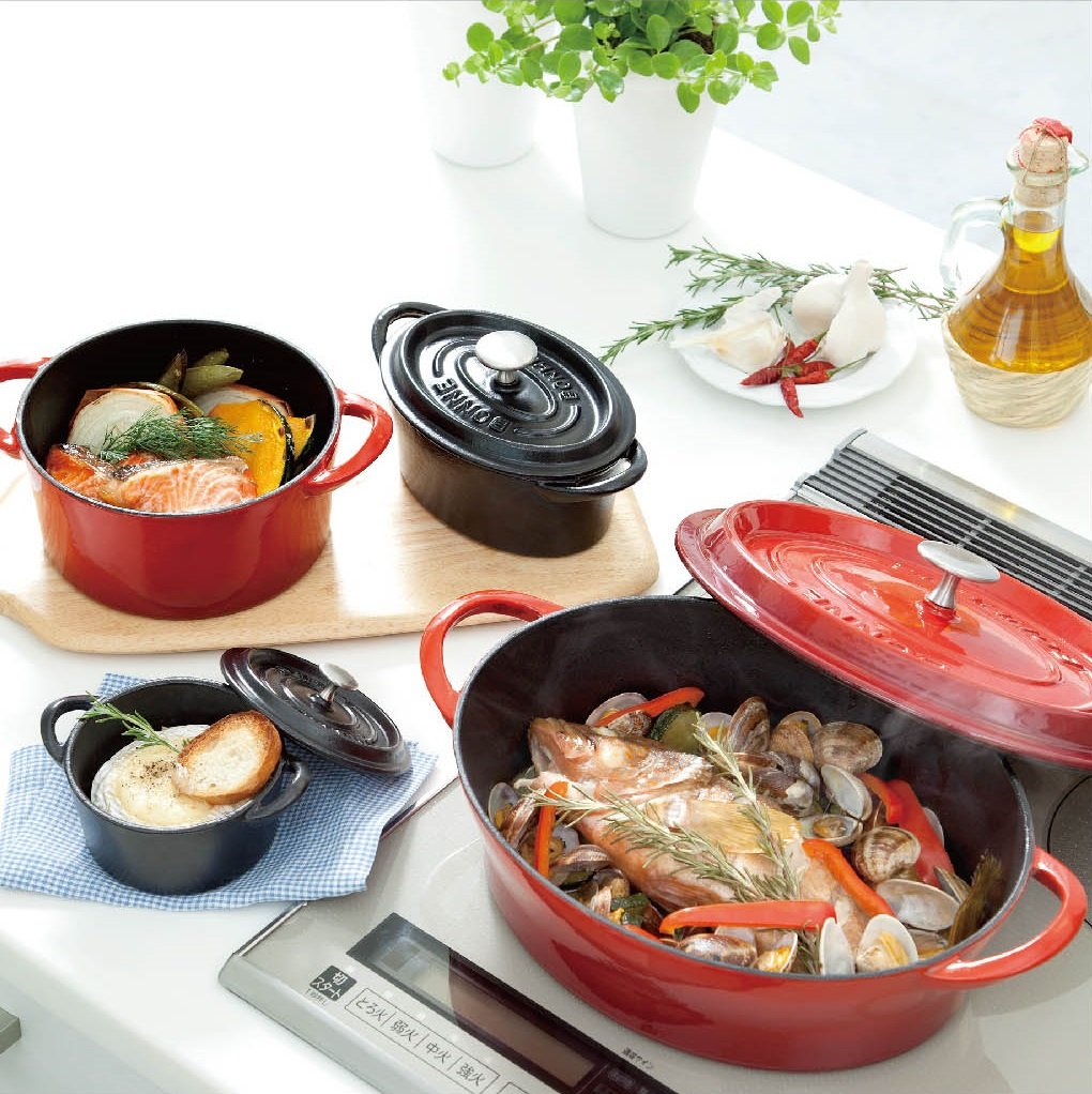 Enameled Bonne Bonaire Casting Hollow Series Heat-resistant heat-resistant and heat-retentive material unique to heat conduction excellent in heat conduction The heavy lid does not escape the moisture emitted from the material, so deep taste of the original material with a small amount of moisture