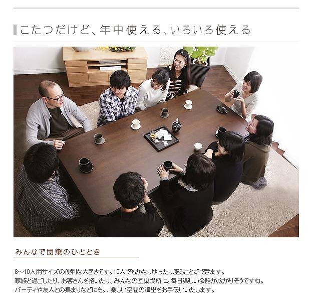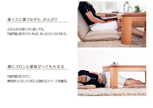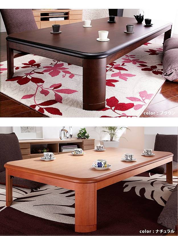 商品について:角が丸く優しさあふれるシンプルなデザインの日本製こたつと色柄豊富なこたつ布団セットです。便利な継ぎ脚付(高さ5cm)。
