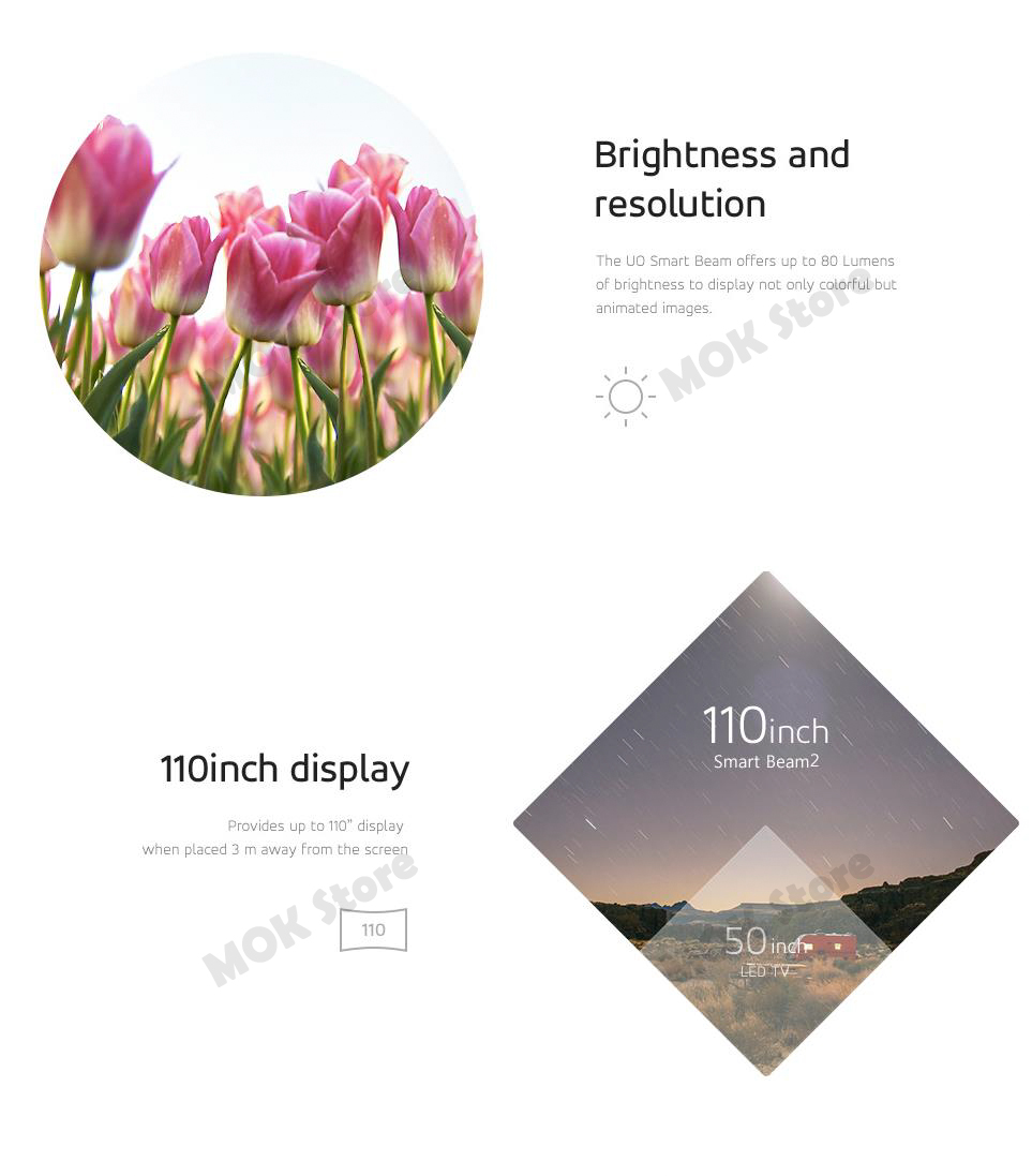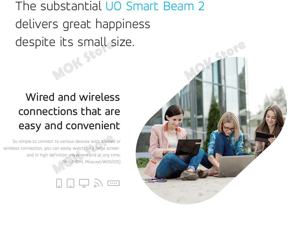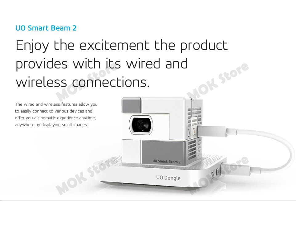 UO Smart Beam 2 which has more convenient features compared to the former beam projector, is a subminiature and a 2nd Edition to Smart Beam. With its compact size that fits in one hand, sensible design and convenient usage, it can be used anywhere – at a camp site, home, office and so on, allowing you to experience great pleasure any time. You can enjoy diverse contents by simply connecting with “MHL” or “HDMI” cable between UO Smart Beam 2 and other smart devices (compatible with MHL/HDMI adopted devices such as Samsung Galaxy S2/3/4/5 and also compatible with Apple devices such as iPhone 4S/5/5S/5C/6 and iPad 2/3/Retina/Mini/Mini with Retina by connecting Apple AV Adapter to HDMI cable). In addition, by connecting UO Smart Beam to UO Dongle, you can enjoy a seamless wireless connection. (Android phone which has mirroring function is recommended to connect wirelessly)