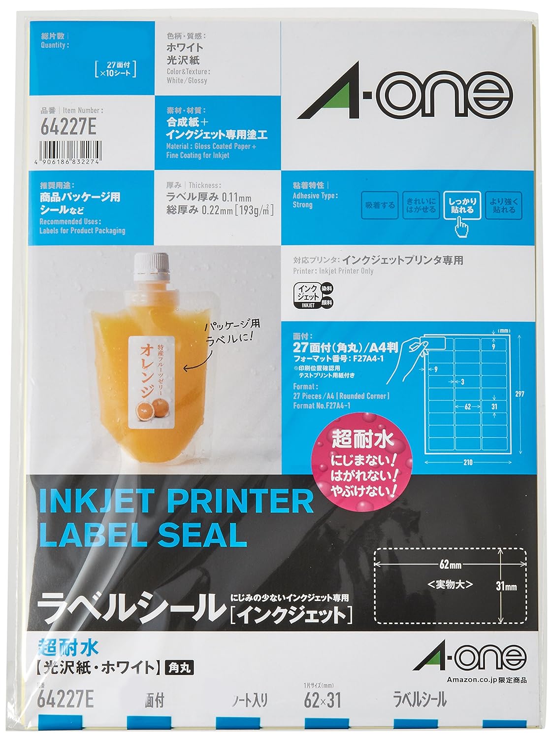 <インクジェットプリンタで印刷した文字や写真が水に濡れてもにじまず、また合成紙なので紙の表面が破けません。 材質:合成紙 +インクジェット専用塗工 シートサイズ:A4 (297mm×210mm) / 1片サイズ: 62mm×31mm 対応プリンタ:インクジェット 入り数:10シート 270片