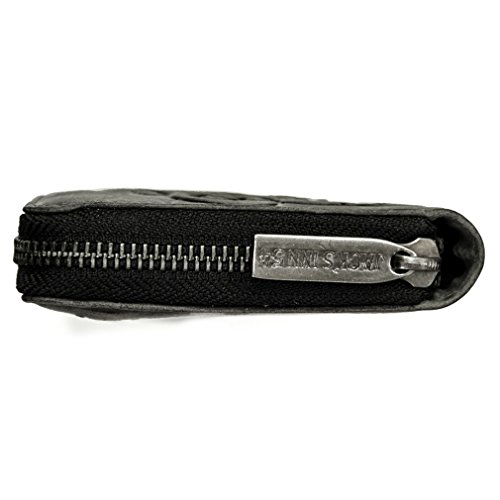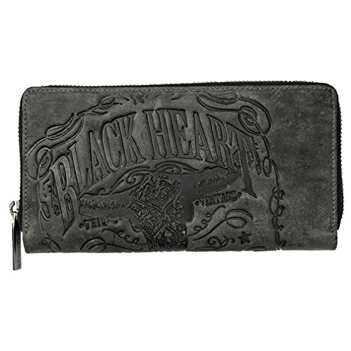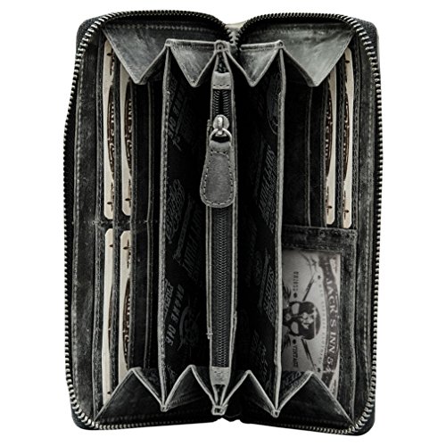 Product Description - Material: Genuine Leather - Dimensions: approx.19 x 2,5 x 10 cm - "Black Hearted" bottle print with cattle skull and "Badass", "Ink On Skin", "Screaming Liver", "Black Soul" and "Go Bad or Go Home" lettering - 4 bank note sized compartments - Total of 4 credit card sized slots - 2 see-through slots - 2 small lengthy slots - Coin compartment with zipper - Zip pocket on outside