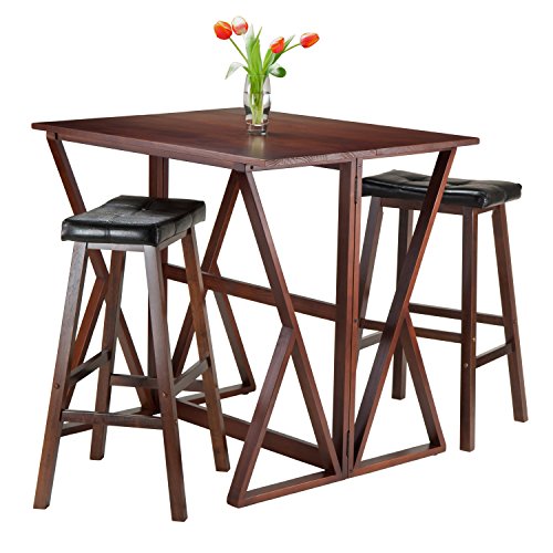 -. Feature : Set includes counter height table and 2 stools / Constructed from solid and composite wood / Walnut finish / Cushioned and tufted black faux leather seats / Drop leaf table seats 2 to 4 people
