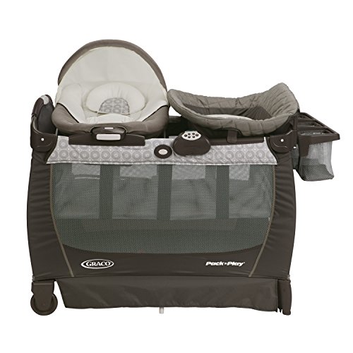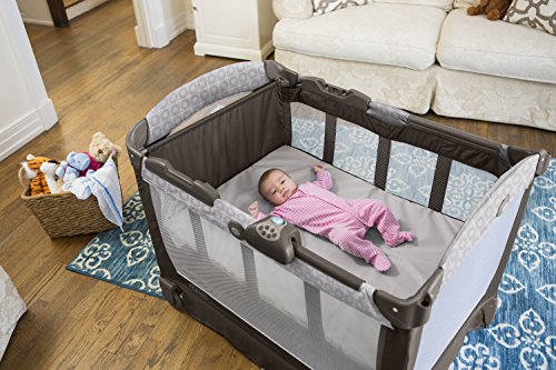 This play yard and baby bassinet has a large extended-use changing station (up to 30 pounds) for easier diaper changes, so you can enjoy time with baby