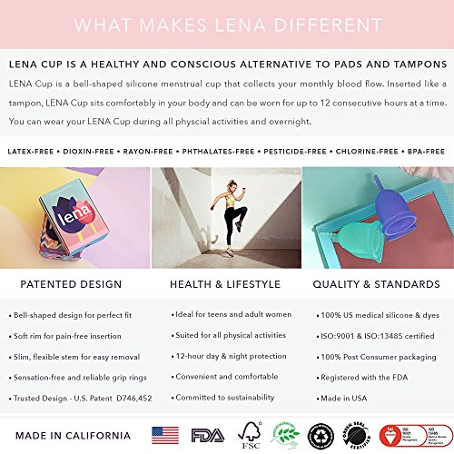 MADE IN CALIFORNIA and FDA-REGISTERED. LENA is the most affordable USA-made and FDA-registered feminine hygiene cup on the market. LENA uses US medical grade silicone and dyes to ensure complete safety and biocompatibility