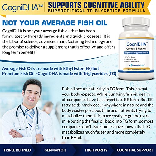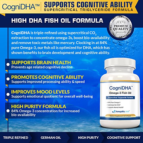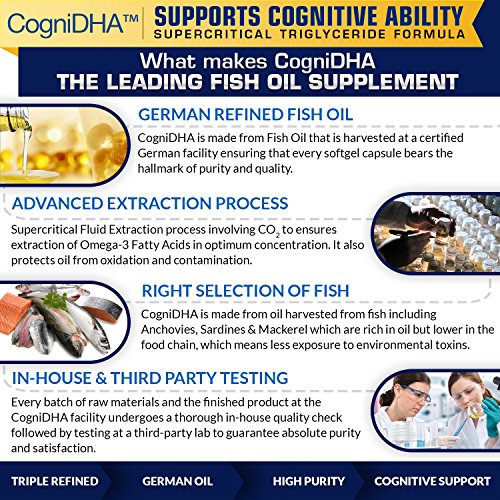 CogniDHA High DHA Fish Oil is in a class of its own. Manufactured in North America using German Supercritical CO2 extracted Triglyceride oil, CogniDHA is designed to supercharge your brain. The specialized extraction process uses advanced techniques to increase bio-availability and purity while removing heavy metals and impurities, which also reduces the fishy after effects. DHA is the the more beneficial of the two fatty acids available in fish oil (there is also EPA), for overall brain health. This is why CogniDHA is optimized for DHA. Our product gives you a high dose of DHA by being highly pure and concentrated. Compare to other cheaper fish oils, that give you a higher dose by selling larger pills. All Natural - NO Yeast, Wheat, Gluten, Soy, Dairy, Corn, Sodium, Starch, Artificial Coloring, Preservatives, or Flavoring. Fish oil is commonly referred to as the single most important supplement you can take for brain health. Start with the best. Start with CogniDHA.Feature