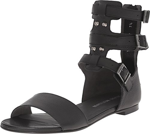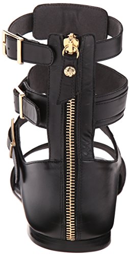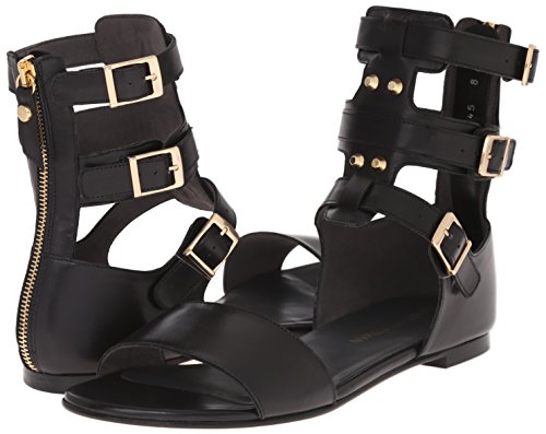 Flat sandal featuring gladiator-inspired shaft with rear zipper and trio of buckled straps