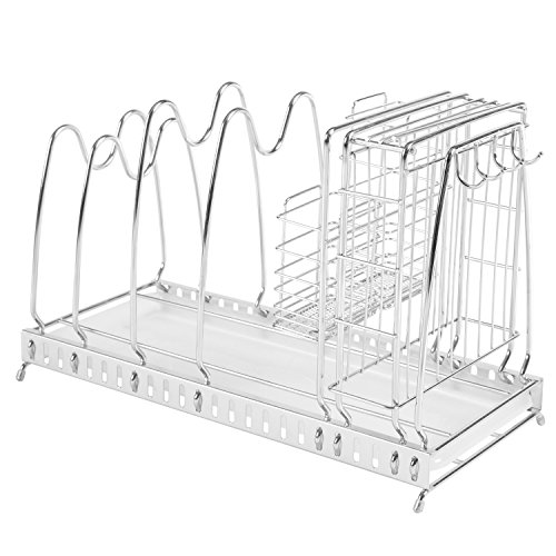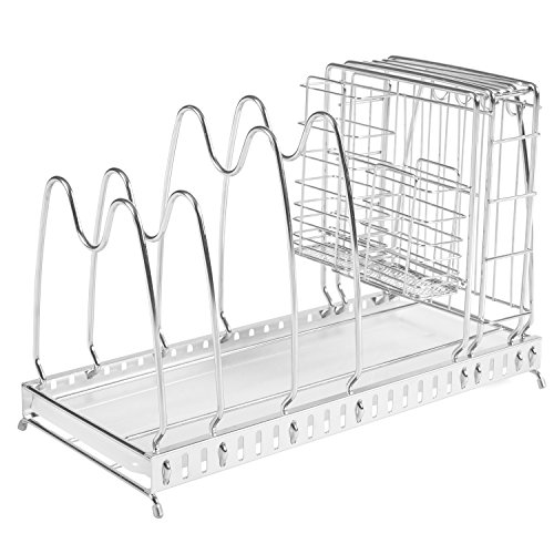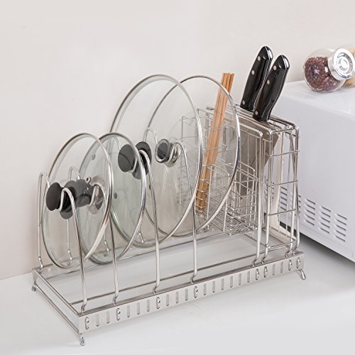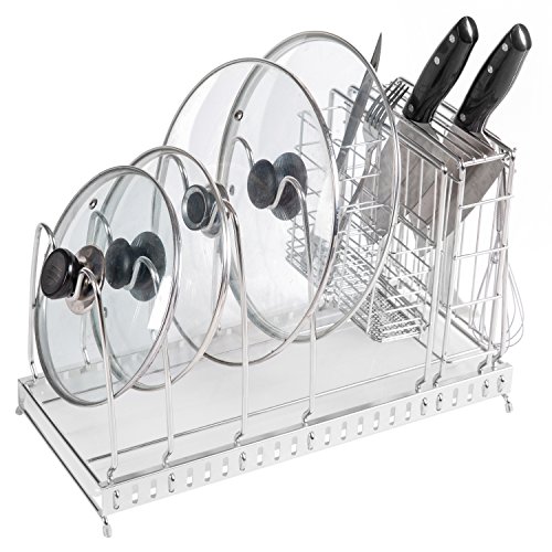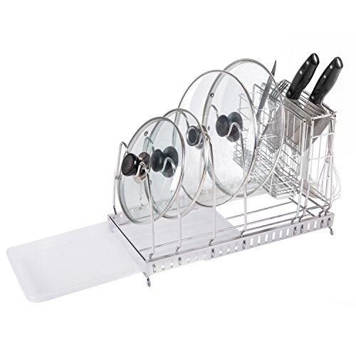 Studio : MyGift Publisher : MyGift Product Description Making the most of a small footprint, this adjustable stainless steel wire pot lid and cutting board drying rack is completely customizable for optimal functionality in a variety of situations. 4 pot lid dividers (2 each of small and large) with handle cradles for a secure hold on lids, and a large end divider (with 4 utensil hooks for hanging small utensils) can be spaced as needed to dry lids, cutting boards, or dishes. A wire knife block and a wire utensil basket provide additional storage; each can be moved as needed. Rubber feet provide stability, and a slide-out plastic drip tray helps to keep the counter dry underneath, making this drying rack ideal for maintaining a tidy countertop in small kitchens. Approximate Dimensions (in inches): 11 H × 16.3 L × 7.9 W. 0 |