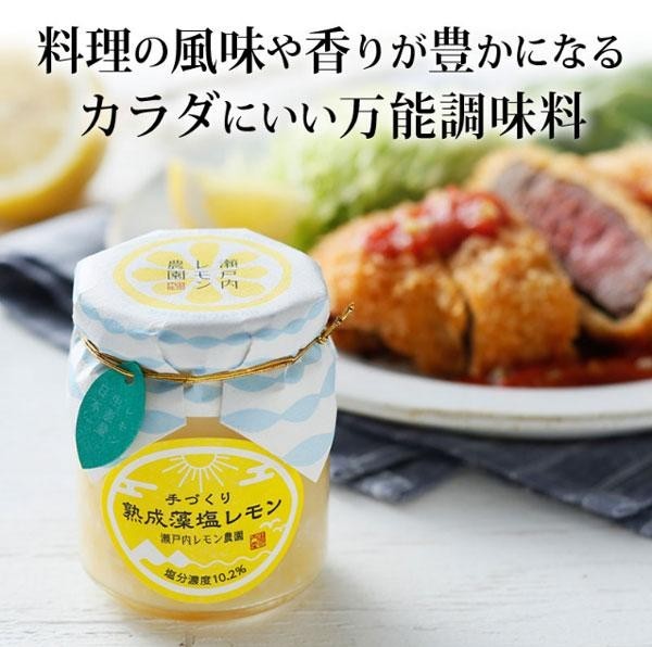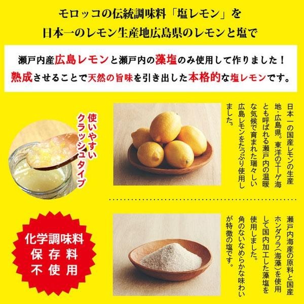 モロッコの伝統的な調味料を瀬戸内海産の広島レモンと藻塩を使用し作りました。化学調味料や保存料を使用せず、レモン皮と果汁、塩のみを使い、天然の旨みが出るまで熟成。塩分濃度は塩レモンに良いとされる約10%に調整を図りました。開封後は更に熟成が進むので、より味がまろやかになり旨みが増していきます。お料理にそのままかけたり、混ぜたり、漬け込んだり、様々な使い方でお楽しみ頂けます。 |