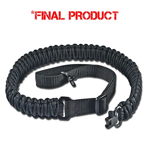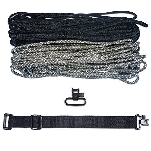 - Kit Includes: Instructions, 60 Feet of 550 LB Paracord, Nylon Webbing w/ Sling Swivel, 1 Sling Swivel