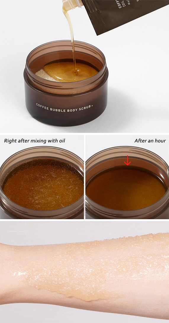 A body scrub made of coffee oil extracted from coffee meal, and sugar grains.