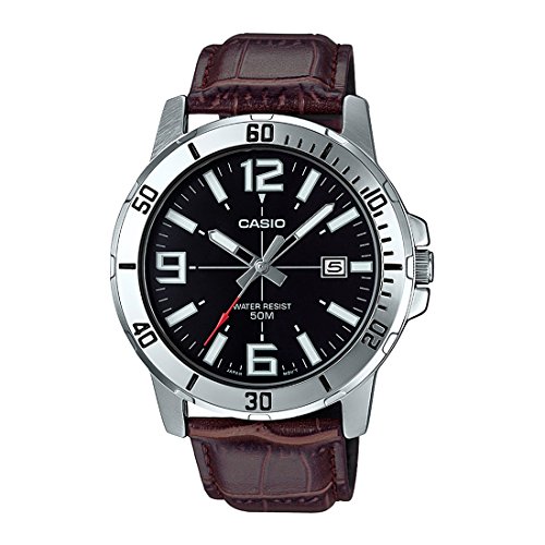 Item model number: MTP-VD01L-1BVUDF (A1370) Batteries: 1 Lithium Metal batteries required. (included) Date first listed on Amazon: January 12, 2012 Brand, Seller, or Collection Name:Casio Model number:MTP-VD01L-1BVUDF (A1370) Part Number:MTP-VD01L-1BVUDF (A1370) Item Shape:Round Dial window material type:Mineral Display Type:Analog Clasp:Buckle Case material:Stainless steel Case diameter:45 millimeters Case Thickness:10.5 millimeters Band Material:leather Band length:Men's Standard Band width:18 millimeters Band Color:Brown Dial color:Black Bezel material:Stainless steel Bezel function:Fixed Calendar:Date Special features:n/a Item weight:2.40 Ounces Movement:Japanese quartz Water resistant depth:50 Meters