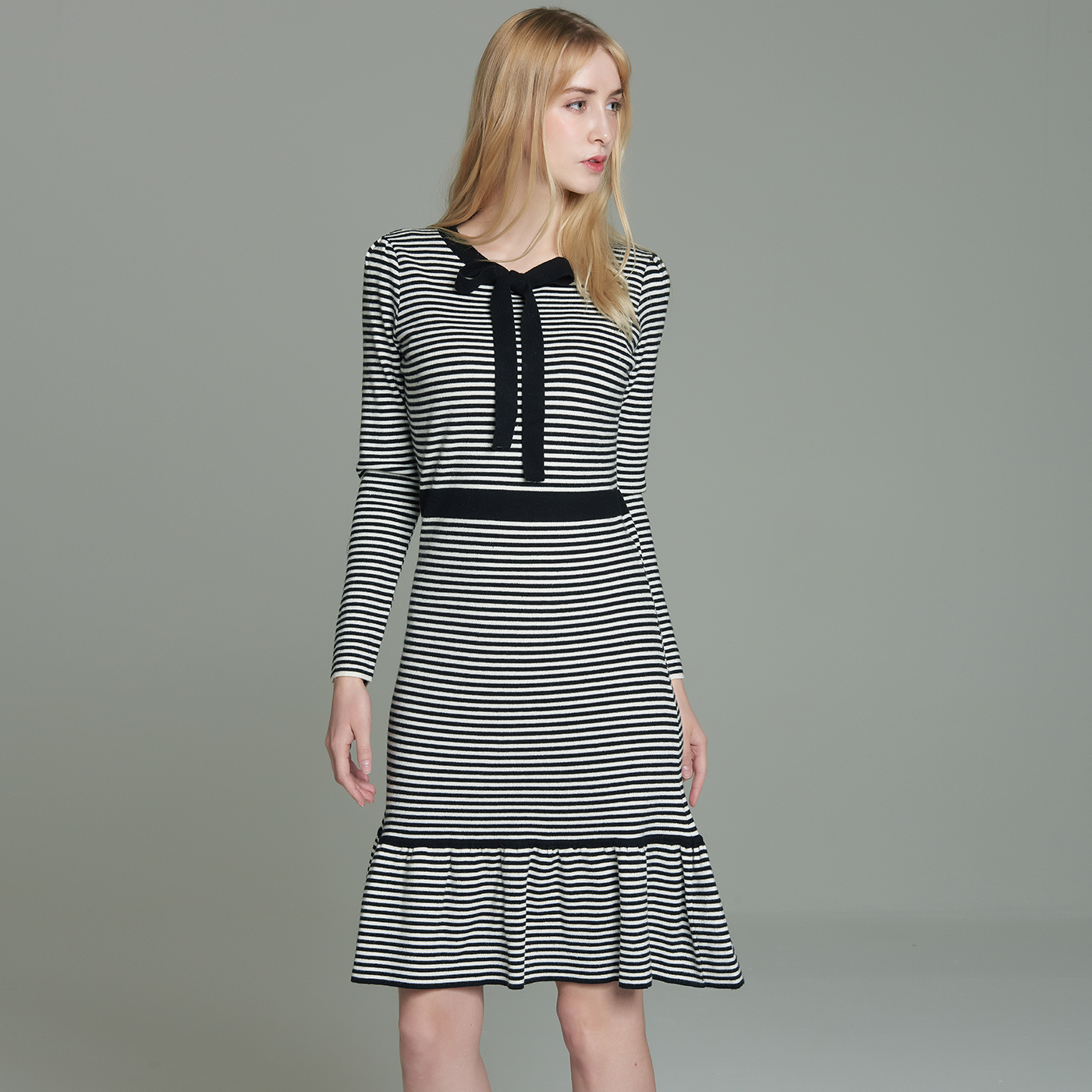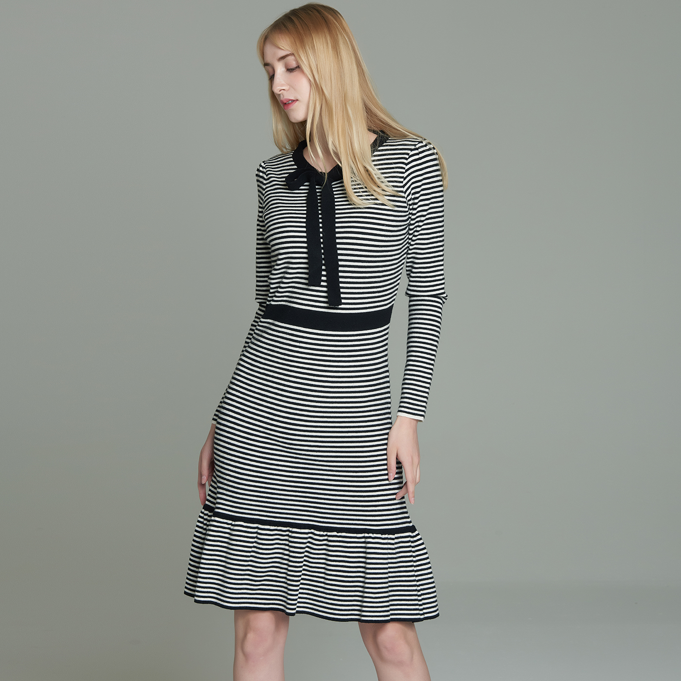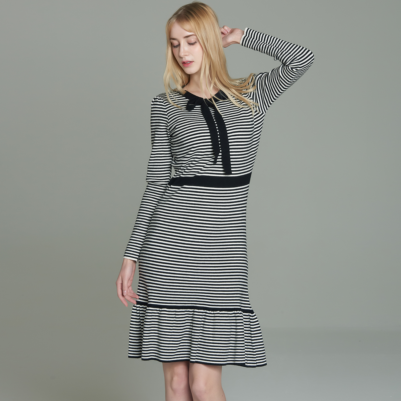 스트라이프 패턴의 슬림한 페플럼 스타일의 귀여운 원피스입니다.