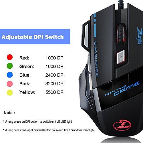 Rapid Moving: 5500 DPI (Dots Per Inch), fitting for most of pro game players. Adjustable DPI Switch: 1000 DPI / 1600 DPI / 2400 DPI (Blue Light)/ 3200 DPI / 5500 DPI.