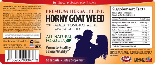 - Feature : Boosts libido, Enhances Performance and energize your body. A powerful combination of legendary aphrodisiac in the world / Each bottle contains 60 capsules, with 1650mg Premium Herbal Blend of Horny Goat Weed powder, Maca, Saw Palmetto, Ginseng, Mucuna Pruriens, Eurycoma Longifolia Jack Extract, Muira Puama and L-Arginine / Supports prostate health and urinary function in men. / Made In USA.