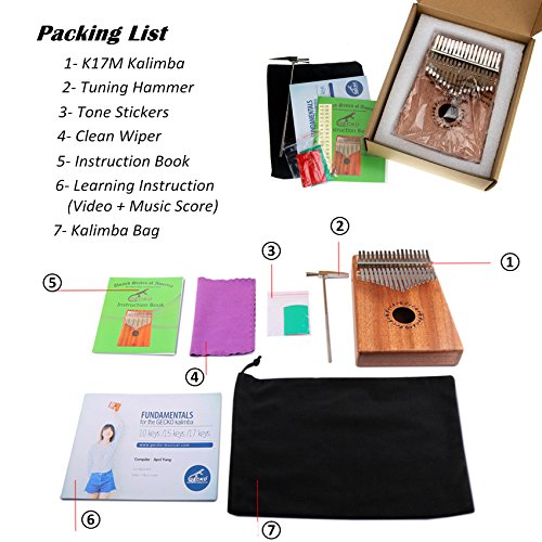 Discription -- Color:Light Brown(Mahogany) -- Tonality: C Key -- Size: 185x135x32mm(7.2""x5.2""x1.2"") -- Num Of Keys: 17 Package Include 1 x K17M Kalimaba 1 x User Manual 1 x Kalimba Bag 1 x Tuner Hammer 1 x Kalimba Learning Instruction(Music Score Vedio)