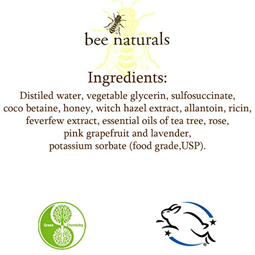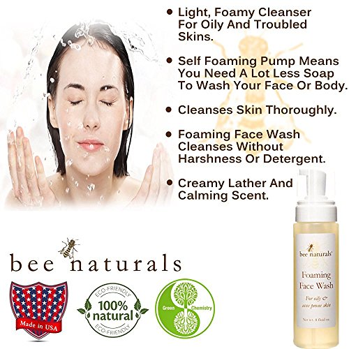 -. Feature : BEE NATURALS SELF FOAMING FACE WASH - Cleanses without harshness or detergent.Does not strip out natural oils which can lead to dryness and flaking. / SOOTHES INFLAMMATION - This oil, salicylate, and medication free cleanser soothes inflammation with feverfew extract, tea tree and rose essential oils while it cleanses thoroughly without stripping your natural oil. This all-natural castile base wash comes in a re-usable, refillable foam pump bottle. / SMALL AMOUNT NEEDED - Self Foaming Pump means you need a lot less soap to wash your face or body. Less damage to your skin and the Face Wash lasts a long time. / MADE WITH ALL NATURAL INGREDIENTS - distilled water, vegetable glycerin, sulfosuccinate, coco betaine, honey, witch hazel extract, allantoin, niacin, feverfew extract, essential oils of tea tree, rose, pink grapefruit and lavender, potassium sorbate, (food grade,USP), and phenoxyethanol. / CREAMY LATHER AND CALMING SCENT - The lather the wash produces is very creamy and the infusion of rose, lavender and grapefruit oils make for a plesant washing experience.