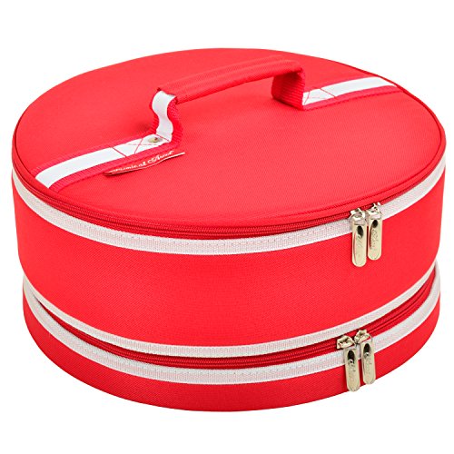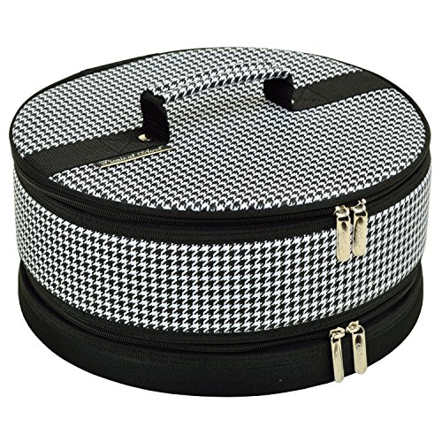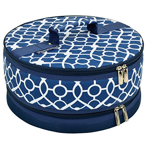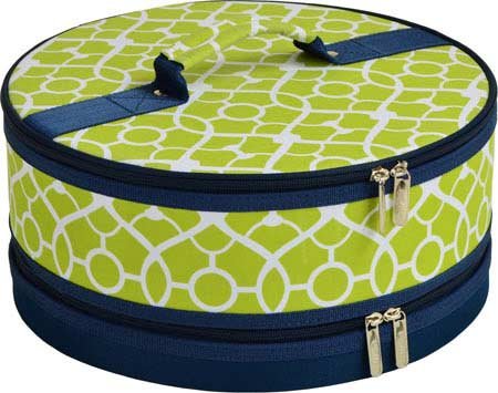 Attractive, highly versatile insulated 12" diameter carrier for cakes, cup cakes, muffins. Pies, appetizers and casseroles. Dual zippers top and bottom for ease of use. Rigid sides and re-enforced lid assure that top of carrier never sags onto toppings. Foil lined with mesh sleeve pocket inside lid. Safely transports food while maintaining its perfect temperature..