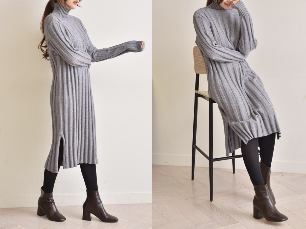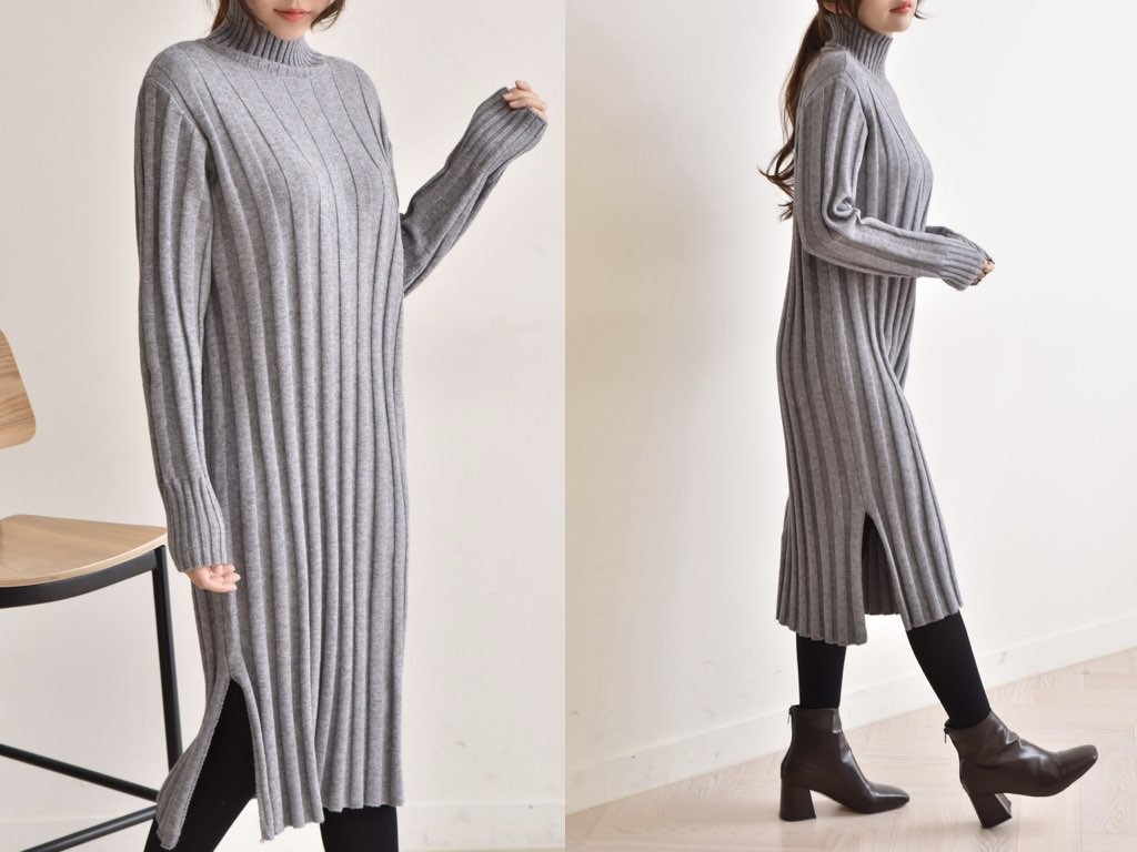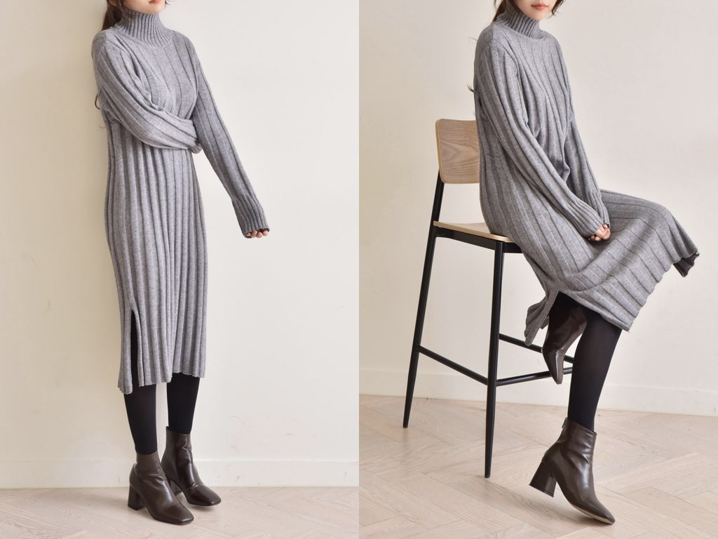 ニット・タートルネックのロングワンピースです。1枚で着れて楽チンなのに、女性らしさも感じられるアイテムの「ワンピース」。ボトムスやレギンスなどを合わせたレイヤードスタイルも素敵ですね。ブーツなどに合わせても素敵です。1.基本情報色:2色展開(グレー/ベージュ/ブラック)サイズ:Free素材:ナイロン48%、レーヨン30%、ポリエステル22%製造国:Korea2.サイズ情報肩幅:44cm身幅(胸断面):52cm腕の長さ:59cm着丈(前):106cm(サイズは計る方法に応じて±2〜3cmの誤差があります。ご了承お願い致します)3.その他の情報厚み:中間透け感:なし伸縮性:あり裏地:なし洗濯方法:ドライ(クリーニング)[注意事項]お取り寄せ商品は、海外より仕入れるため納品まで約10日前後いただきます。また店舗でも販売しており、在庫切れになる場合もございます。ご了承お願い致します。