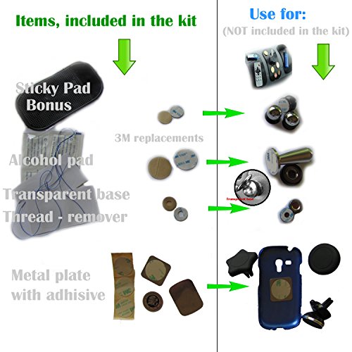 -. Feature : ✓ The kit is Universal. Allows to replace repair improve or convert your magnetic phone tablet holder car dash or air vent mounted / ✓ Take care of the surface where you mount: Alcohol pads, super thin and strong threads (string for safely steel ball, magnet and metallic plate removing ), transparent adhesive base to cover spot on your phone or car / ✓ 4 kinds of 3M's VHB foam tape. Both side self adhesive sticker. 1 side glue transparent pad. / ✓ 3 kind of sticky metallic plates for magnetic cell mounts / ✓ GIFT: Sticky pad non-slip washable reusable mat. Your stuff will not slide away from you while you are driving. You can hold there coins, glasses, keys, phone, anti radar etc...