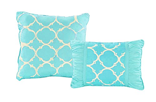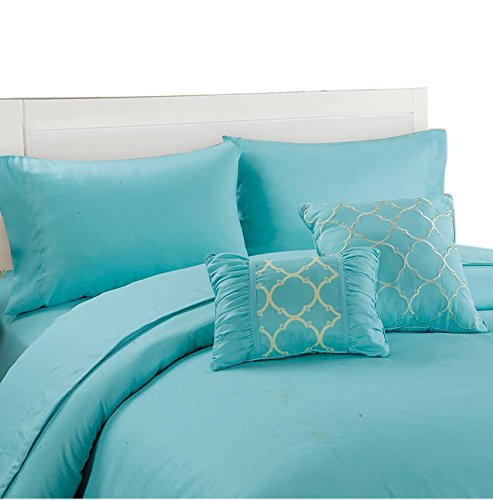 This stylish new 6 piece bed set exudes royalty with its geometric design on the throw pillows with ruffle detailing and its light and inviting colors to brighten up any room and draw in the eye.