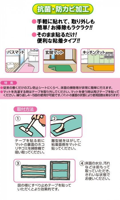 特殊技術により生まれたオレフィン樹脂100%からなるズレ防止テープです。表面強度が強く、耐久性に優れています。マットに貼り付けることでお掃除などの移動も楽にできます。マットやカーペットの裏面の4辺と中心部分に貼ることで効果を発揮します。抗菌・防カビ配合。 |