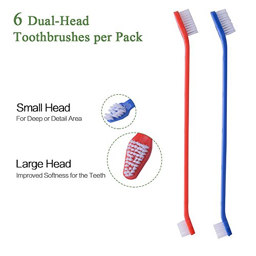 Features: Two in One There are 6 double sided toothbrushes which have two heads(a small & a large). The large head is used to clean the front tooth while the small head is used to clean the inside ones. It's more flexible for you to choose which head is more effective for your dog.
