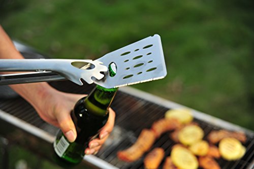 ALL YOU NEED 6-in-1 for cutting chicken, hamburger or steak. The attached LED flashlight allows you to continue grilling even in the dark. The retractable tongs allow for the uninhibited use of the spatula.