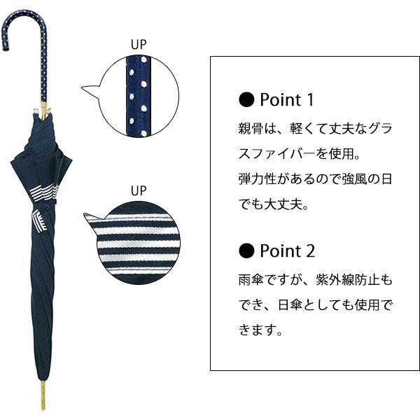 fk094igrjsボーダーテープのリボンがポイントですハンドルにもドットがプリントされています サイズ (約)親骨:55cm、傘の直径:91cm 個装サイズ:10.0×68.0×7.7cm 重量 約300g 個装重量:350g 素材・材質 親骨:グラスファイバー(8本使用) 生地:ポリエステル 仕様 開閉:ジャンプ 生産国 中国 テープリボンを施した、ジャンプタイプの長傘 ボーダーテープのリボンがポイントですハンドルにもドットがプリントされています