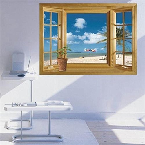 -. Title : Danyoun 3D Beach Lattice Window View Wall Stickers, Removable Open Window Wall Mural Sticker, Sea View Art Wallpaper Mural for Dining Room, Bedroom, Windows
