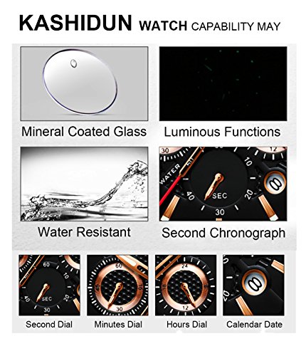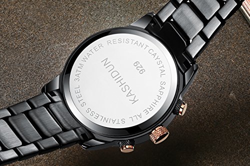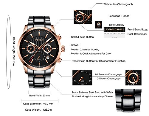 -. Feature : Fashionable sporty style watch design with Japanese quartz movement / Durable and lightweight black stainless steel case and band with fold-over-clasp closure / Chronograph functions and date window(an easy to operate date window is located at 4 o'clock). / Waterproof: water resistant to 30 meters(99 feet), in general, withstands splashes or brief immersion in water, but not suitable for swimming or bathing; If you have any questions, Please feel free to contact KASHIDUN After-sale Service Email: kashidun.ur@hotmail.com / Gift Ideas: Sporty watch with elegant box is a great gift choice to your loved ones for Christmas, birthday, anniversary, Father's Day, graduation and Valentine's Day, Or as a business and party present.