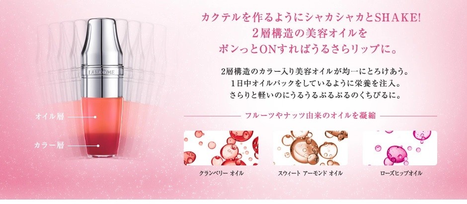 | 商品説明 | カクテルを作るようにシャカシャとHAKE! 2層構造の美容オイルをポンっとONすればうるさらリップに。 2層構造のカラー入り美容オイルが均一にとろけあう。 1日中、オイルパックをしているように栄養を注入 さらりと軽いのにうるうるぷるぷるのくちびるに。