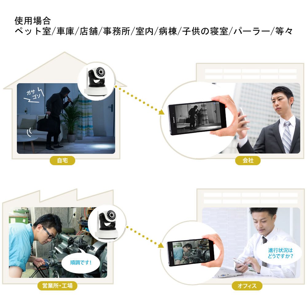 Watching over children and pets (cats, dogs) in an answering machine / for girls' care for elderly / gifts for friends / for telecommuting equipment / presence / absence of fire / outdoor eaves / conference transit night intruder.