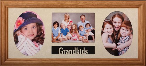 -. Feature : Cream Marble Laser Cut Mat Insert. Light/Medium Stained Oak Frame. / Sanded and Fine Finished. Laser Cut Text Grandkids. / Holds 3 - 5x7 Photos ~ Two (2) Portrait and One (1) Landscape. E-Z Bent Tabs to easily Access Photos. Glass front. Wall Mount and Easel Display Ready. / A Wonderful Thoughtful Gift Idea for Grandparents from the Grandkids/Grandchildren. / Makes a Treasured Keepsake Frame for a Grandma, Grandpa or Grandparents!